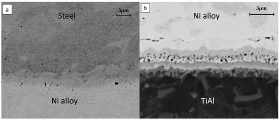 The higher magnification back-scattered electron image of the junction (Figure 3) indicated the diffusive interfaces generated during the joining procedure. On the side of the steel (Figure 3a), it was not possible to observe the formation of any new phases during the welding procedure, there was only a gradient of elements at the interface between the Ni alloy and the steel. In contrast, a very complex interface was detected at the diffusive interface between TiAl and the Ni-based alloy (Figure 3b), as previously demonstrated in the works of Tetsui T. [] and Liu J. et al. [], where they bonded a TiAl alloy to a nickel-based filler material and pure nickel, respectively. As a result of solid-state diffusion, several layers were produced, with thicknesses of about 6 µm.