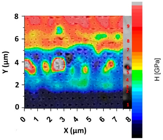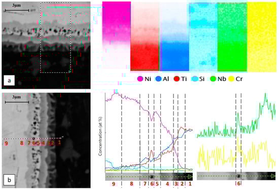 Finally, it was possible to observe a lighter grey continuous layer (number 8 in Figure 4), where there were some traces of Ti and Al diffusion, but the composition started approaching the composition of the nickel alloy. The nickel-based material was finally reached in the next zone (number 9 in Figure 4), whose composition corresponded to that reported previously (see Figure 2). In Figure 4a,b or Figure 5, it is possible to appreciate the silicon-rich regions discussed previously. In particular, the nanoindentation showed higher values of hardness for these zones, in accordance with the increased hardness in the layer labelled with number 7, which was also rich in silicon.
