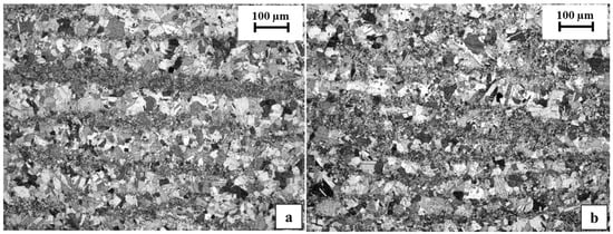 In order to evaluate the microstructure of the TiAl part and to check whether it was ultimately affected by the temperature reached during welding, the polished specimen was etched with Kroll’s solution and analyzed by optical microscopy. The resulting microstructure was an equiaxed gamma microstructure, as was expected for the as-EBM TiAl material [,,]. However, a layered appearance of the microstructure, in which bigger and smaller grains were alternated, was observable (Figure 6), which would be worth avoiding through fine tuning of the process parameters of the Electron Beam additive manufacturing process [,]. Nonetheless, for the purposes of the present work focused on joining, a fact that is interesting to point out emerges when comparing the microstructure in an area close to the junction region (Figure 6a) with the microstructure observed in another area of the specimen far from the junction (Figure 6b). No microstructural modification due to the temperatures reached during the joining process could observed, and therefore, microstructure was not affected during the welding.