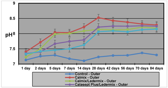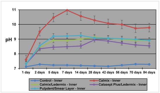 The Calmix group exhibited a higher pH than the both the Calmix/Ledermix and Calasept Plus/Ledermix groups at all time intervals. The Tmax (time taken to reach maximum pH) for Calmix in the inner dentine was one week compared to four weeks for both the Calmix/Ledermix and Calasept Plus/Ledermix groups. The Tmax in the outer dentine was eight weeks for all groups apart from the control group (10 weeks), but the controls had no real increase in pH from the baseline levels.