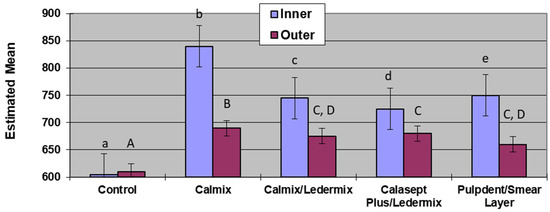 Analysis of the area under the curve across the different medicament groups (Table 2 and Figure 3) allowed the total release of hydroxyl ions to be compared. The control group, as expected, was significantly lower than all other groups in both the inner and outer dentine. Calmix had the highest amount of total release of hydroxyl ions for both the inner dentine and outer dentine measurements, and these were statistically significantly higher than the other experimental groups. The medicament group combinations that were not statistically significantly different from each other were the outer dentine measurements of the Calasept Plus/Ledermix group and the Calmix/Ledermix group, as well as the Calmix/Ledermix group compared with the Pulpdent/smear layer group.