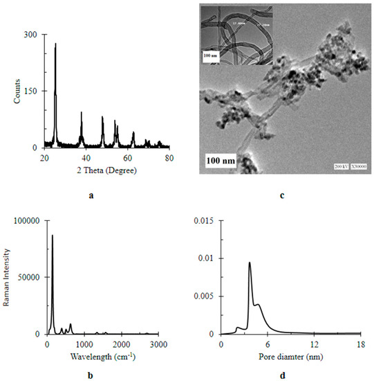 Characterization of titanium dioxide-decorated multi-walled carbon nanotubes (MWCNTs/TiO2) (a) XRD (X-Ray Diffraction) pattern; (b) Raman spectrum; (c) TEM (Transmission Electron Microscopy) image at a magnification bar of 100 nm (inset bare MCNTs); (d) pore diameter.