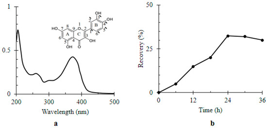 Colorimetric assay of quercetin (Q) (a) UV-visible spectrum of Q [1 × 10−6 M]. Inset the chemical structure of Q; (b) the rate of Q relative recovery by titanium dioxide-decorated multi-walled carbon nanotubes (MWCNTs/TiO2) over time (36 h).