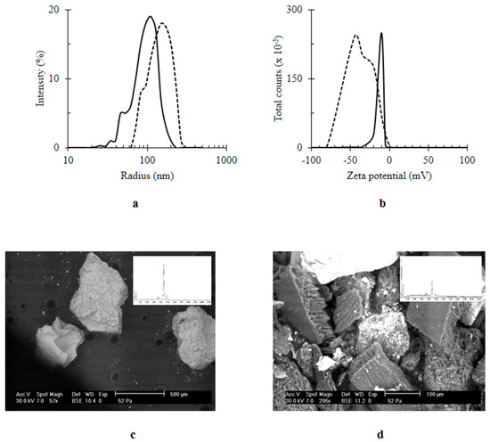 The effect of immobilization of quercetin (Q) on titanium dioxide-decorated multi-walled carbon nanotubes (MWCNTs/TiO2) (a) size (nm); (b) zeta potential (mV); (c) SEM image of MWCNTs/TiO2; (d) SEM image of Q/MWCNTs/TiO2. In (a,b) MWCNTs/TiO2 was represented by the continuous line (ـــــــــ) and the quercetin titanium dioxide-decorated multi-walled carbon nanotubes nanocomposite (Q/MWCNTs/TiO2) was denoted by the dashed line (----). Inset (c,d) EDX spectra.