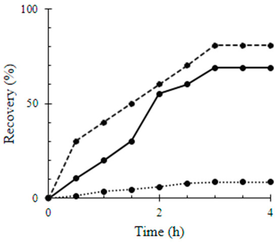 Relative recovery percentage of quercetin (Q), titanium dioxide-decorated multi-walled carbon nanotubes (MWCNTs/TiO2), and quercetin titanium dioxide-decorated multi-walled carbon nanotubes nanocomposite (Q/MWCNTs/TiO2) by the glass slides over time. Q, MWCNTs/TiO2 and Q/MWCNTs/TiO2 was symbolized by the dot (…..), continuous (ـــــــــ) and the dashed (----) lines; repetitively.