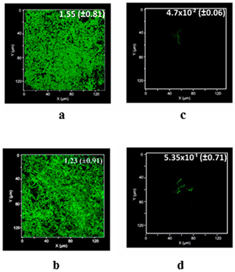 Microscopy: After 24 h, the tested slides were collected from the petri dishes, placed on microscopy glass slides and then covered with coverslips (24 × 50 mm). A layer of nail polish was applied on the corner of the coverslips in order to fix this arrangement. The slides were then observed using Zeiss LSM780 Confocal Laser-Scanning Microscopy (CLSM) fitted with a 488-nm laser an EC Plan-Neofluar 63× oil immersion objective (Carl Zeiss Microscopy GmbH, Jena, Germany). About 6–10 independent locations were selected and recorded at random positions on the glass slides from independent duplicated samples. The image stacks were analyzed using Comstat script [58] and the biomass of the attached cells was estimated from the calculated intensities.