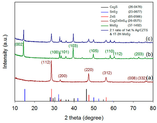 XRD pattern of (a) CZTS powders using the conventional hydrothermal process (CHT) at 180 °C for 72 h; (b) MoS2 powder using the CHT process at 200 °C for 24 h; (c) 2:1 ratio of 1 wt% Ag/CZTS and 1T-2H MoS2.