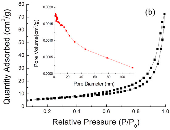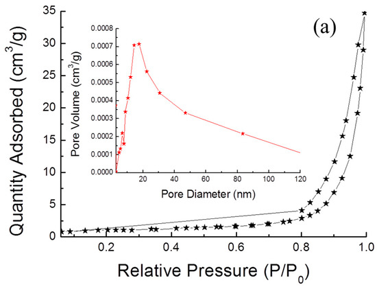 Figure 4 shows the Brunauer–Emmett–Teller (BET) analysis using N2 adsorption-desorption isotherms and the corresponding Barrett–Joyner–Halenda (BJH) pore size distributions curves (inset). The surface areas of the CZTS powders and 1T-2H MoS2 are measured as 3.38 and 21.39 m2 g−1, respectively. The insets are the BJH pore volume are 0.045 and 0.096 cm3 g−1, and the pore size distribution plot, for which the adsorption average pore diameters are 31.74 and 18.02 nm, respectively. It can be seen that there are differences in the morphology results in different specific surface areas (SSAs), which indicates that the MoS2 has a higher SSA than is the case for the CZTS powders due to the fact that the microflower shape provided a higher surface area. However, the pore size of the 1T-2H MoS2 is smaller than that of the CZTS powders. This may be because the alkaline solution of diethylenediamine (DETA) acted as an etchant and increased the excess thiourea, which is an intermolecular force and polarity molecule during the synthesis of the CZTS powders, resulting in the formation of more pits on the surface [28,29]. Therefore, the larger SSA and pore diameter in the Ag/CZTS/MoS2 contributed to active enhancement of photo-catalytic efficiency [24].