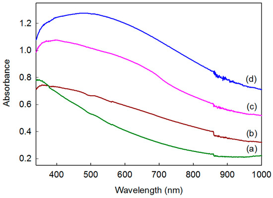 UV-VIS absorption spectra of (a) CZTS; (b) 1 wt% Ag/CZTS; (c) 10:1 ratio of 1 wt% Ag/CZTS and 1T-2H MoS2; and (d) 2:1 ratio of 1 wt% Ag/CZTS and 1T-2H MoS2.