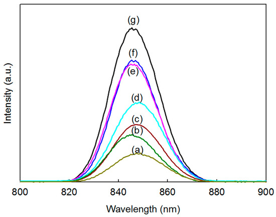 PL spectra of (a) 2:1 ratio of 1 wt% Ag/CZTS and 1T-2H MoS2; (b) 10:1 ratio of 1 wt% Ag/CZTS and 1T-2H MoS2; (c) 1 wt% Ag/CZTS; (d) 2 wt% Ag/CZTS; (e) CZTS; (f) 4 wt% Ag/CZTS; and (g) 8 wt% Ag/CZTS.