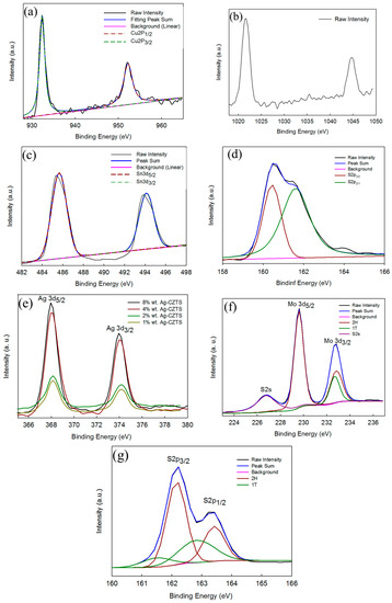 High-resolution XPS characterization of as-synthesized (a) Cu 2p; (b) Zn 2p; (c) Sn 3d; (d) S 2p; (e) Ag NPs; (f) Mo 3d; and (g) S 2p.