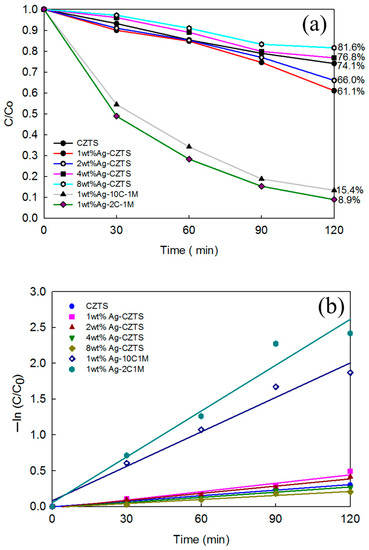 A photocatalytic technique is considered a promising method for treating organic dyes in wastewater [1,2]. I2-II-IV-VI4 quaternary chalcogenide semiconductors Cu2ZnSnS4 (CZTS) are non-toxic, Earth-abundant, and inexpensive, and they have a high absorption coefficient >10−4 cm2 for potential application as solar-cell absorbers [3,4,5]. However, due to the fact that their optimum band gap is ~1.5 eV, they easily recombine into photogenerated holes and electrons. Thus, it is necessary to reduce the recombination rate. TiO2 is a well-known n-type metal oxide photocatalyst in many photocatalytic applications, including hydrogen generation and water splitting in environmental and energy-related fields [1,6,7,8,9]. However, its relatively large band gap of 3.2 eV is only a small fraction (4%) of the solar spectrum. Several studies have investigated ways to achieve better absorption and charge carrier mobility under visible light through the use of a dopant [10,11,12,13]. Koichi Awazu et al. labeled this new phenomenon “plasmonic photocatalysis”, where silver (Ag) nanoparticles (NPs) are coated with a passive material such as SiO2 to prevent oxidation and to separate TiO2. Their work indicated effective surface plasmon resonance transfer of photogenerated holes on the surface enhanced photocatalytic reaction [14].