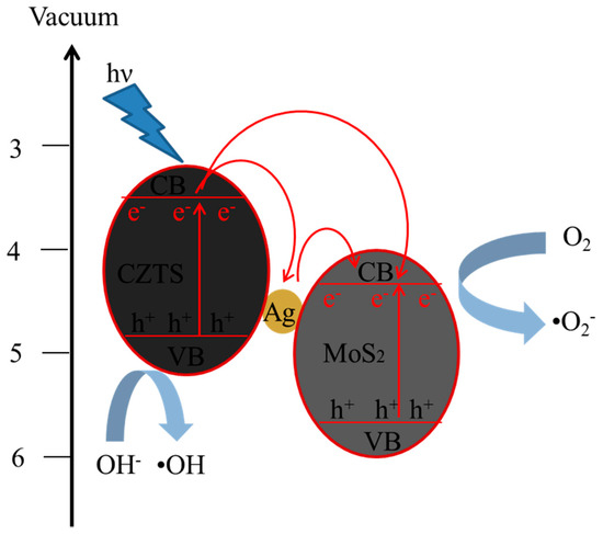 The photocatalysts of the I2-II-IV-VI4 quaternary group exhibit better absorption ability under visible light than TiO2. Therefore, Xuelian Yu et al. prepared CZTS-Pt and CZTS-Au heterostructured NPs using a synthesis route [20]. The results showed enhanced photocatalytic activity toward photodegradation and hydrogen generation by water splitting. Feng Jiang et al. reported a multilayer of Pt/In2S3/CdS/CZTS heterostrucures, where the obtained photocathode showed significant enhancement in terms of stability during photoirradiation for PEC water splitting [21]. Hybridized 1T-2H MoS2 was then added to provide higher electrical conductivity and the specific surface area necessary to achieve superior catalytic ability [22,23,24]. Importantly, Ag was added in the structure to extend the light absorption of the photocatalyst to the visible light region, which was due to the surface plasmon resonance of Ag NPs, which enabled the photocatalyst to absorb light in the visible spectrum. Owing to these outstanding characteristics, we report a novel design of three-component Ag/hybridized CZTS/1T-2H MoS2 heterojunction photocatalysts using a facile hydrothermal method. Since their appropriate band gap structures and stability enhance properties that include light harvesting, charge separation, and transfer photoactivity, it is essential to develop this method on a photocatalytic mechanism.