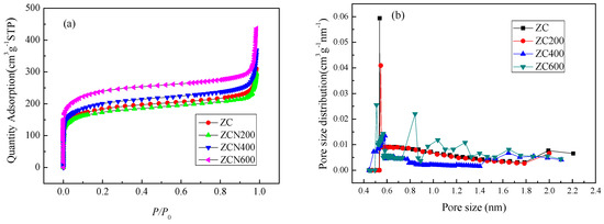 Figure 3 shows nitrogen adsorption isotherms of the ZCs samples. The ZC and the modified ZCs samples exhibit type IV isotherm profiles according to the (IUPAC) classification. For the ZC and the modified ZCs samples, the nitrogen adsorption sharp increase at low relative pressure and at high relative pressure indicates the presence of microporosity and macroporosity, respectively [43]. The pore size and the surface area of different materials are listed in Table 1. After carbonization of ZIF-8 at 900 °C, the specific surface area and total pore volume are 624 m2 g−1 and 0.46 mL g−1, respectively. After ZC ammonia treatment, at 200 °C and 400 °C, the specific surface area and the total pore volume did not change, whereas the highest values are after treated at 600 °C (805 m2 g−1 and 0.62 mL g−1). A significantly increase in microporosity was detected in the sample obtained by NH3 treatment at 600 °C, maybe attributing to ammonia decomposing to free radicals such as NH2, NH, and H at 600 °C. The gasification of carbon occurs in the form of methane, hydrogen cyanide and cyanogens due to the attacking from these radicals [44]. The pore size distribution of ZC samples is shown in Figure 3b. The pore size of the sample is mainly distributed around 0.55 nm. Compared with ZC, the pore size distribution of ZCN200 does not change. However, at 600 °C, this increase of larger microporous size may be attributed to ammonia decomposing to free radicals such as NH2, NH, and H at 600 °C.