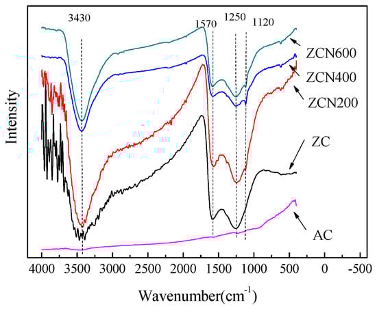 The FTIR spectra of the ZC and the treated ZCs samples are presented in Figure 4. The ZC contains several peaks, the 1250 cm−1 assigned to C-N (at 1250 cm−1) [45], and 1570 cm−1 attributed to C=N and N–H groups [46,47]. At 200 °C ammonia treatment, the spectrum do no change. However, at 400 °C and 600 °C ammonia treatment caused some changes. From the spectral comparison of the ZCs samples, it was found that there was a difference at 1120 cm−1 due to the presence of C–O [48]. After heating to 400 °C under the ammonia atmosphere, it is observed that the C–O peak significantly increased. However, the amount of C–O groups decreased at 600 °C [49]. The weak bands at ca. 3430 cm−1 can be attributed to the presence of the N–H and O–H symmetric stretching vibration [44].