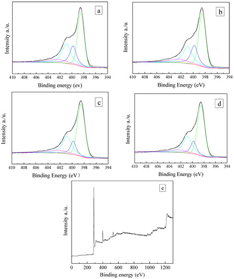 N1s spectrum of the ZC samples: (a) ZC; (b) ZCN200; (c) ZCN400; (d) ZCN600 and (e) XPS survey spectra of ZC.