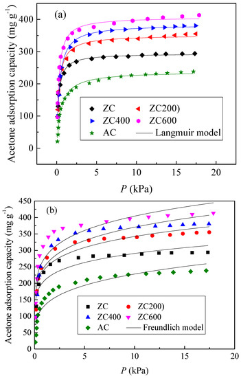 where p is the adsorption pressure of acetone, q is the adsorption capacity (mg g−1), KL qmax are Langmuir isotherm constants, where qmax signifies the theoretical monolayer capacity, Kf (mg g−1) is the Freundlich constant and 1/n (dimensionless) is the heterogeneity factor. The adsorption isotherms obtained at 25 °C and predictions of the Langmuir and Freundlich models are shown in Figure 7. The corresponding characteristic parameters of the models along with the correlation coefficients are given in Table 3. From Table 3, determination coefficient, R2 of Langmuir equation is >0.99, indicating the good agreement with the experimental data for these adsorbents.