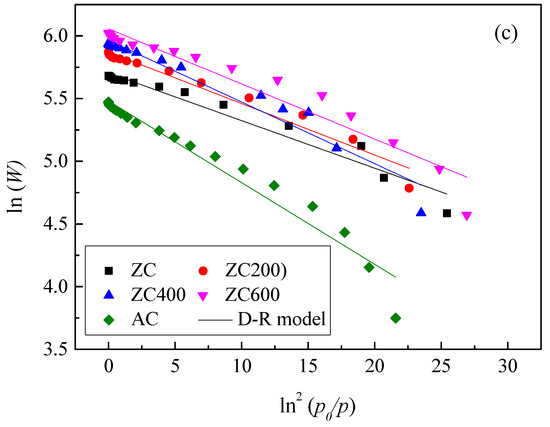 Figure 7c shows plots of ln (W) versus ln2(p0/p) for acetone adsorption on five carbon materials and applies linear regression to the experimental data, W0 and E can be calculated from the intercept on the ordinate and the slope of the linear-regression line, respectively. Compared to the Freundlich model, the D–R model can better represent the current data, but worse than the Langmuir model.