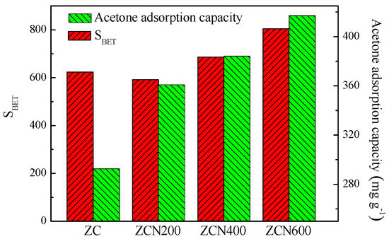 It is generally believed that a higher acetone adsorption capacity depends on the large specific area of adsorbents. However, the adsorption of acetone on adsorbents in this work may yield a different result. The relationship between acetone saturated adsorption capacity and specific surface area is shown in Figure 8. It is clear that ZC having higher specific surface area than ZCN200 (see Table 1) provides the lower acetone saturated adsorption capacity (see Table 3). Compared with ZC, ZCN200 has higher acetone saturated adsorption capacity of 360.9 mg g−1, which increases by 17.4%, indicating that surface treatment by ammonia improves the affinity between acetone and carbon surfaces. Therefore, acetone saturated adsorption capacity of the ZCs samples is not closely related with the specific surface area. The reason may be that nitrogen groups in ZCN200 might increase polar character of the carbon surface and promote the affinity between acetone molecules and the carbon surface. Enhanced acetone adsorption of ZCN400 and ZCN600 is due to the improvement in nitrogen content and specific surface area.
