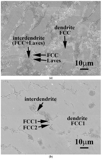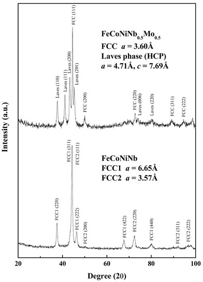 - Both FeCoNiNb0.5Mo0.5 and FeCoNiNb alloys had dual-phased dendritic structures. The phases in FeCoNiNb0.5Mo0.5 alloy were FCC and laves phases, and the dendrites exhibited an FCC phase. The phases in FeCoNiNb alloy were FCC1 and FCC2 phases, and the dendrites exhibited an FCC1 phase.