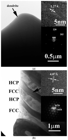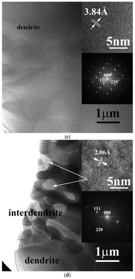 The phases of the FeCoNiNb0.5Mo0.5 alloy and FeCoNiNb alloys were all identified by TEM, as shown in Figure 3. The micrograph of each phase in the FeCoNiNb0.5Mo0.5 alloy and FeCoNiNb alloys was examined carefully, and the FFT diffraction pattern of each phase was obtained from its high-resolution lattice images. Figure 3a shows a TEM image of an FCC dendrite of FeCoNiNb0.5Mo0.5 alloy, and the insets present the corresponding lattice image and FFT diffraction pattern, which indicates that the image was taken with a beam direction of [111]. Figure 3b shows a TEM image of a HCP-structured laves phase in the interdendrite of FeCoNiNb0.5Mo0.5 alloy, which was obtained with a beam direction of [0001]. Figure 3c shows a TEM image of an FCC1 dendrite of FeCoNiNb alloy, which was obtained with a beam direction of [12]. Figure 3d shows a TEM image of an FCC2 phase in the interdendrite of FeCoNiNb alloy, which was obtained with beam direction of [12].