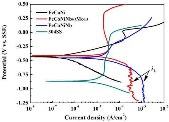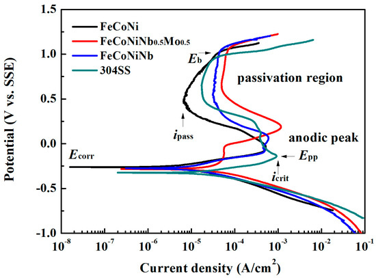 Polarization curves of FeCoNiNb0.5Mo0.5, FeCoNiNb, FeCoNi and 304SS alloys in 1 M deaerated H2SO4 solution at 30 °C.