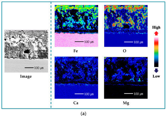 Electron probe microanalyzer (EPMA) cross-sectional mapping results of specimens after 30 days immersion in seawater with Mg2+ ions: (a) blank steel and (b) 0.7-wt.%-Cr steel.