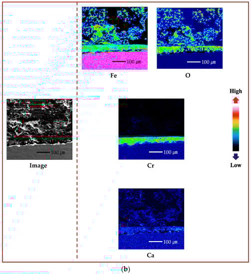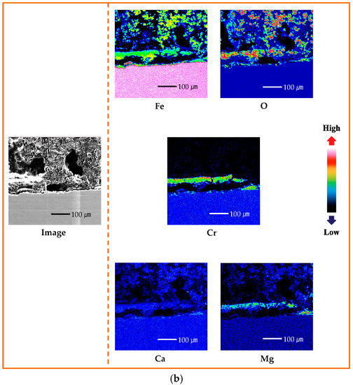 In regard to the seawater cation, Ca is distributed in the rust layers on both the blank- and 0.7-wt.%-Cr steel rust layers. Mg, however, showed a different trend in both of the specimens, as follows: It is distributed throughout the rust layer on the blank steel, but it is condensed in the 0.7-wt.%-Cr steel; furthermore, the concentrated-Mg region is included in the Cr-enrichment layer. From this result, it was expected that both the Mg and the Cr would contribute to the corrosion resistance. Thus, to identify the Cr–Mg synergic effect, the experiment was conducted in both the presence and the absence of the Cr-alloying element and the Mg2+ ions, in seawater.