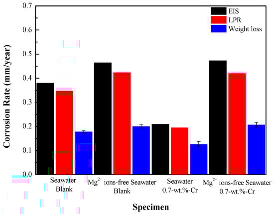 where 87,600 is the metric- and time-conversion factor, W is the weight loss (g), A is the exposure area (cm2), t is the immersion time (h), and ρ is the density (g/cm3). Figure 2 shows the corrosion rates of the blank and 0.7-wt.%-Cr steels after the 30-day immersion in seawater, with and without the Mg2+ ions. The corrosion rates calculated by EIS, LPR, and weight loss tests showed the similar trend in all three experiments: The average corrosion rates of the steels decreased in the following order: 0.7-wt.%-Cr steel without the Mg2+ ions ≈ blank steel without the Mg2+ ions > blank steel with the Mg2+ ions > 0.7-wt.%-Cr steel with the Mg2+ ions. This result shows that the Cr-alloying element only improved the corrosion resistance in the seawater containing the Mg2+ ions. The difference in the corrosion rates of the blank steel, in the presence and absence of the Mg2+-containing seawater, is due to the Mg(OH)2 that acts as a physical barrier. In the 0.7-wt.%-Cr steel, the difference in corrosion rate between the Mg2+-containing and Mg2+-free seawater solutions is larger than that of the blank steel, which can be explained by not only the Mg2+-containing effect, but also the barrier effect between the Mg2+, Fe2+, and Cr3+ ions. As shown in Figure 1b, it is expected that the Mg2+, Fe2+, and Cr3+ ions that are concentrated near the substrate will form a compound and act as a barrier against corrosion.