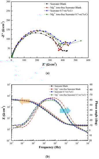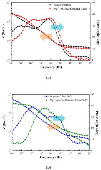 Figure 6 shows the EIS Bode plots of the blank and 0.7-wt.%-Cr steels, with and without the Mg2+ ions, for the 30-day immersion in the synthetic seawater at 60 °C. The splitting of the phase angle frequency curve indicates the presence of other phases.