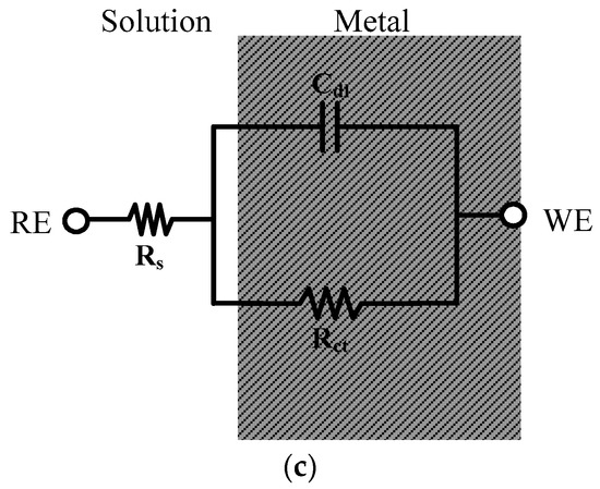 The Nyquist and Bode plots of the specimens after 1 day of immersion are shown in Figure 3a,b. Since the formation of the rust layer is insignificant, the impedance results can be fitted to the circuit model that is shown in Figure 3c, as one time constant, and the impedance parameters that are listed in Table 1.