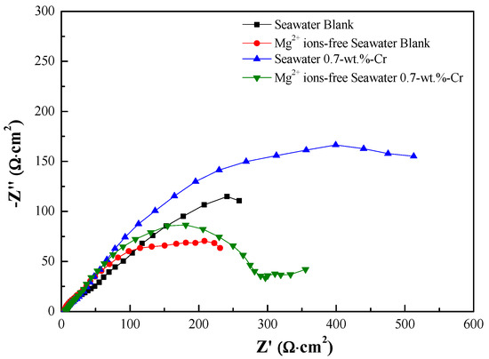 - The EIS analysis, LPR tests, and weight-loss tests, with and without the Cr-alloying element and the Mg2+-containing seawater, revealed the following order for the average corrosion rates of the steels: 0.7-wt.%-Cr steel without the Mg2+ ions ≈ blank steel without the Mg2+ ions > blank steel with the Mg2+ ions > 0.7-wt.%-Cr steel with the Mg2+ ions. The Cr-alloying element only improved corrosion resistance in the Mg2+-containing seawater, and the reason is not only the Mg2+-containing effect, but also the barrier effect between the Mg2+, Fe2+, and Cr3+ ions.