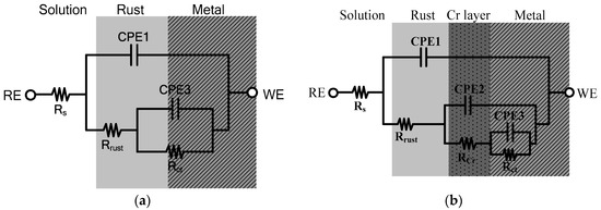 Equivalent circuit models for interpretation of the impedance spectra after 30 days: (a) blank steel and (b) 0.7-wt.%-Cr steel.