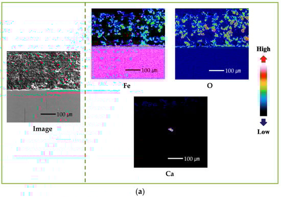 Figure 7 shows the cross-sectional EPMA-mapping results for the Mg2+-free seawater during the 30-day immersion. The tendencies, distributions, and concentrations of the Fe, oxygen (O), and Cr between the rust layer and the substrate are similar to those of the Mg2+-containing seawater, as shown in Figure 1. The 0.7-wt.%-Cr steel, with and without the Mg2+ ions, represents the Cr-enrichment layer, and the average thicknesses are approximately 25 μm and 45 μm, respectively. The Cr-enrichment layers are produced by the corrosion of the specimens, and the Cr3+ ions are redeposited onto the steel surface through reduction reactions [39]. Thus, the thicker thickness of the Cr-enrichment layer without the Mg2+ environment means that more corrosion occurred on the steel surface. This result means that the corrosion rate is more affected by the porosity than the thickness of the Cr-enrichment layer. The Rp values that were measured at the 1- and 30-day immersions, which are shown in Table 1, indicate that the rust layer porosity affects the corrosion rate. In the Mg2+-containing seawater environment, both the blank and 0.7-wt.%-Cr steels increased the Rp over time, whereas the Rp decreased for both of the specimens in the Mg2+-free-seawater environment; this is because the base steel corrosion continues through the porous region of the rust layer.