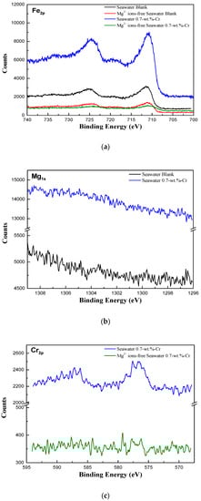 XPS spectra for the cross-sectional products of the specimens after 30 days immersion according to seawater conditions and alloying elements: (a) Fe, (b) Mg and (c) Cr.