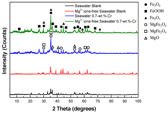 To determine the chemical composition of the corrosion product after the 30-day immersion test, X-ray photoelectron spectroscopy (XPS) and X-ray diffraction (XRD) measurements were carried out. The local area near the Cr-enrichment layer was detected using XPS with the cross-section specimen, and the whole area was detected by XRD with a top-view specimen. Figure 8 shows the XPS spectra of the specimens. The Fe peaks were commonly found in all of the specimens, but the Mg and Cr peaks appeared in accordance with the experimental environment and the alloying element. The steel surface products that were obtained from the analysis of the XPS peaks are listed in Table 2. In Figure 8a, a proportional relationship is evident between the intensity values of the chemical compounds, such as magnetite (Fe3O4), iron(III) oxide (Fe2O3), and iron hydroxide (FeOOH), and the corrosion resistance. The increase in the amount of the Fe oxide products resulted in an enhanced corrosion resistance because the Fe oxide products act as the corrosion protection layer of the steels [34,40]. Similarly, in Figure 8b,c, the high intensity values of the Mg and Cr peaks mean that the effects of the Mg and Cr barriers react more significantly on the 0.7-wt.%-Cr steel in seawater. The difference in the intensity value is due to not only the amounts of the Mg(OH)2, chromium(III) oxide (Cr2O3), chromium hydroxide (CrOOH), and iron(II) chromite (FeCr2O4), but it is also owing to the formation of Mg and the Cr-containing product, magnesium(II) chromite (MgCr2O4). MgCr2O4, the structure of which is spinel, is known for its corrosion resistance improvement property [41,42,43,44]. It also acts as a p-type-semiconductor corrosive film that prevents the corrosion reaction [45]. Thus, the formation of MgCr2O4 increases the corrosion resistance of the 0.7-wt.%-Cr steel in seawater.