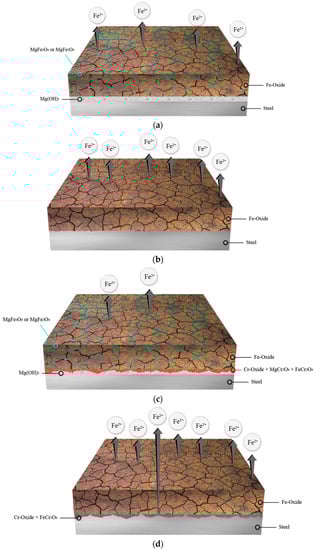 The XRD spectra of the specimens are shown in Figure 9. The Fe corrosion products show the same XPS results, but the other corrosion products, such as magnesium magnetite (MgFe3O4) and magnesium iron oxide (MgFe2O4), which are not shown in the XPS data, were detected. Wang et al. [46] reported that the existence of MgFe2O4 in the rust layer exerts a protective effect on weathering steel. Also, since the structure of MgFe2O4 is spinel, like that of MgCr2O4, this improves the corrosion resistance. The MgFe2O4 acts as an n-type-semiconductor corrosive film that works as a cation-selective rust layer [42,47,48]. Based on the surface analysis, the schematic diagrams of the corrosion products that affect the corrosion property are represented in Figure 10. Due to the corrosion barriers, such as MgFe3O4, the MgFe2O4 with Fe oxide, Cr oxide, FeCr2O4, and Mg(OH)2, the corrosion resistance of the 0.7-wt.%-Cr steel is the highest in seawater. In particular, for the 0.7-wt.%-Cr steel in seawater, the Cr oxide, FeCr2O4, and MgCr2O4 mixed layers contributed to the enhancement of the corrosion resistance. The corrosion resistance of the blank steel in seawater is the second highest, due to the MgFe3O4, the MgFe2O4 with Fe oxide, and Mg(OH)2. The corrosion resistance of the blank steel in the Mg2+-free seawater, which only comprises an Fe oxide corrosion barrier, is lower. Although the 0.7-wt.%-Cr steel in the Mg2+-free seawater consists of Fe oxide, Cr oxide, and FeCr2O4 barriers, the corrosion resistance is similar to that of the blank steel under the same seawater conditions. This phenomenon is due to the less-protective Cr oxide and FeCr2O4 layers and the galvanic-corrosion effect. On the steel surface, the Cr oxide and FeCr2O4 layers without the MgCr2O4 comprise the porosity property, as shown in the EIS results. Also, since the Cr oxide and the FeCr2O4 do not cover the steel surface perfectly, the Cr oxide behaves as the large cathode and the bare-steel surface behaves as the small anode. Thus, the large ratio of the cathode-to-anode surface area accelerated the galvanic-reaction corrosion of the 0.7-wt.%-Cr steel [28].