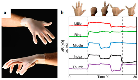 Besides metal-based materials, other conductive materials such as carbon-based materials, lithium ions, and zinc have been used for the AM of high-resolution conductive features. As an important type of conductive materials, carbon-based materials such as carbon black, carbon nanotubes (CNTs), carbon nanofiber, and graphene have been added into polymeric materials due to their excellent conductive and sensing abilities [31]. For instance, carbon black particle inks were used to fabricate flexible strain sensors and piezoresistive sensors by material extrusion, which could embed functional sensors and electronics in a single and low-cost process [35]. Muth et al. [36] used carbon conductive grease, an inexpensive suspension of carbon black particles, to print highly stretchable sensors within an elastomeric matrix. The embedded sensors could sense the change of resistance at different hand positions as shown in Figure 4a,b. Zhang et al. [37] mixed reduced graphene oxide with polylactic acid (PLA) to print stretchable 3D conductive structures, which achieved a very high conductivity of 600 S/cm. CNTs were also printed on papers that could maintain their electrical connectivity after repetitive folding and unfolding cycles. Jeong et al. [38] used a polymer blend comprising polystyrene sulfonate (PSS) and multiwall carbon nanotubes (MWCNTs) to prepare EHD printing inks with different properties. The printed MWCNT/PSS lines with minimum width of 89 μm displayed a maximum conductivity of 39.3 S/cm and were used as source/drain electrodes in highly reliable organic field-effect transistors (OFETs). The carbon-based conductive materials were used as functional additives in micro-/nano-scale 3D printing techniques. However, the conductivity and stability of the additive-manufactured structures from carbon-based materials were susceptible due to the use of insulating polymers and dispersity of carbon-based materials.