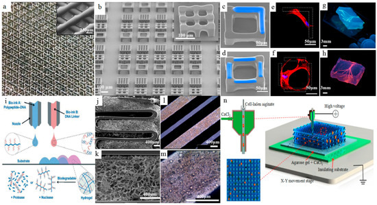 Traditionally, cells were seeded into hydrogel scaffolds which could not possibly mimic the actual anatomical composition [12]. In recent years, cell printing technology, which allowed 3D living tissues or organs to be manufactured directly based on layer-by-layer deposition of cell hydrogels, was developed as a novel type of AM process for the next generation of manufacturing [67,68]. On one hand, some new cell hydrogels were used in cell printing for better imitation of the natural microenvironment. For example, Pati et al. [69] utilized novel cell-laden decellularized extracellular matrix (dECM) gels for the printing of cell-laden constructs capable of providing an optimized microenvironment conducive to the growth of three-dimensional structured tissue. This cell printing method enabled the printing of cell-laden dECM structures with high cell viability and functionality. Particular tissue constructs were printed with cell-laden dECM gels as shown in Figure 6j–m. On the other hand, some typical hydrogel materials like collagen, polyvinyl alcohol, and sodium alginate could be mixed with living cells as the printing ink for high-resolution cell printing [70]. For example, Shinjiro et al. [71] employed electrohydrodynamic 3D bioprinting to print alginate droplets with an average diameter ranging from several micrometers to tens of micrometers. The printed droplets were gelled instantly once deposited onto the CaCl2 coated substrates and a 3D biological structure could be stacked by controlling the movement of the print-head. Our group developed an electrohydrodynamic cell printing strategy with microscale resolution (<100 μm) and high cellular viability (>95%). Compared with the existing electrohydrodynamic cell jetting or printing explorations, an insulating substrate was used as the collecting surface which significantly reduced the electrical current in the electrohydrodynamic printing process from milliamperes (>0.5 mA) to microamperes (<10 μA). Moreover, the nozzle-to-collector distance was fixed as small as 100 μm, which benefited filament deposition control and stacking into 3D [72]. In another study by our group, a novel coaxial nozzle-assisted electrohydrodynamic cell printing strategy was developed to fabricate living 3D cell-laden constructs with filament dimension about 80 μm and cell viability over 90%, as shown in Figure 6n [73].