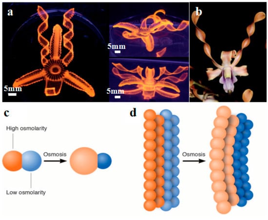 Shape-shifting structures fabricated by 4D printing. (a,b) Biomimic shape-shifting flowers, reprinted from [87] with the permission of Nature Publishing Group, Copyright 2016; (c) Schematic of two droplets of different osmolarities joined by a lipid bilayer. The flow of water through the bilayer causes the droplets to swell or shrink; (d) Schematic of a droplet network that comprises two strips of droplets of different osmolarities. The transfer of water between the droplets induces an overall deformation of the network; (e) Photographs of a rectangular network folding into a circle over about 3 h, reprinted from [88] with the permission of The American Association for the Advancement of Science, Copyright 2013.