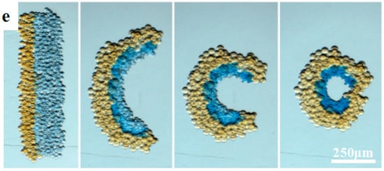 High-resolution smart structures fabricated by 4D printing from shape-shifting materials can change their shapes or properties with time or space, which makes it possible to precisely control microscopic shape changes and provides novel tools for potential applications in soft microrobotics, biomedical engineering, microscale biomimetics, and drug delivery. For example, Ge et al. [86] prepared lamina composites by printing glassy fibers within an elastomeric matrix. Glassy fibers with a size of 32–64 μm exhibited shape-shifting properties when the temperature was over their glass transition temperature. The printed 3D structures can be thermomechanically programmed to different complex configurations. Gladman et al. [87] demonstrated a novel biomimetic 4D printing technique by the extrusion of a programmable material solution which contained clay, monomer, nanofibrillated cellulose (NFC), photoinitiator, enzyme/glucose, and deionized water. The printed flower structures with the smallest filament size of about 100 μm could be controlled to change their shapes as shown in Figure 7a,b. This programmable shape-shifting behavior was mainly caused by the differences in the swelling ratios of active and rigid materials under water. Villar et al. [88] employed high-resolution material jetting to print two kinds of materials with different osmolarity properties (Figure 7c). The printed straight lines have the smallest diameter of 50 μm, which can be further transformed into a circular structure as shown in Figure 7e. The shape-shifting is enabled by the osmolality gradient of the KCl droplets in the printed structures (Figure 7d).