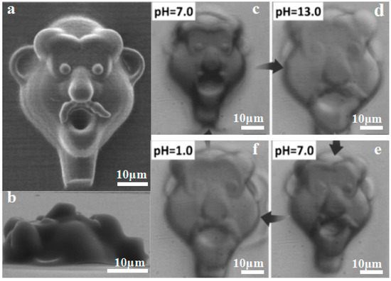 Shape-shifting proteins were recently developed for high-resolution 4D printing, owing to their characteristics in response to chemical signals. For instance, Sun et al. [89] made photocrosslinked protein with bovine serum albumin (BSA) and a photosensitizer methylene blue, and used it to fabricate micro-/nano-scale architectures by directed energy deposition. The pH-responsive materials could be printed into protein microlenses with diameter from 1 μm to 100 μm, exhibiting rapid and reversible swelling-to-shrinking behavior. As shown in Figure 8a–f, a 3D relief portrait of a face was printed and swelled to about 150% when the pH value was increased from 7 to 13. Lee et al. [90] used two-photon photolithography to print 3D BSA–protein hydrogel microstructures ranging from 10 to 30 µm with programmable shape changes. By spatially controlling the cross-linking density of BSA at a nanometer length scale, directional responsiveness of printed 3D microstructures was achieved with high precision.