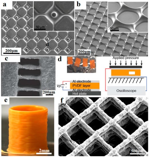 4D-printed smart piezoelectric microstructures. (a,b) Different microstructures printed by digital projection printing (DPP), including (a) square arrays and (b) honeycomb arrays, reprinted from [93] with the permission of American Chemical Society, Copyright 2014; (c,d) Printed using projection microstereolithography (PμSL) technique for an all-polymer-based piezoelectric device, reprinted from [94] with the permission of Elsevier, Copyright 2017; (e) One-step 4D-printed piezoelectric cylinder; (f) SEM image of inclined top view of a 3D spanning 9-layer piezoelectric scaffold, reprinted from [95] with the permission of American Chemical Society, Copyright 2017.