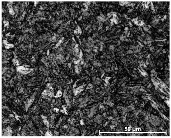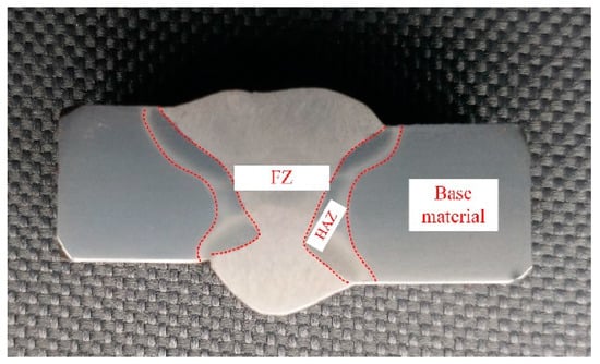 The variation in micro-hardness across the weld zone is shown in Figure 8. The FZ, HAZ, and BM can be clearly distinguished based on this variation. The micro-hardness of the material is influenced mainly by the microstructure and grain size. Generally, the different phases in steel can be arranged in descending order of micro-hardness magnitude, as follows: martensite > bainite > pearlite > ferrite [].