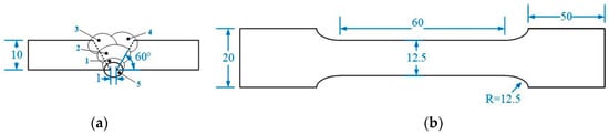 Welding pass sequence and tensile specimens: (a) Welding pass sequence; (b) Dimensions of the tensile specimens (the thickness of tensile specimens is 8 mm; all dimensions are in millimeter).