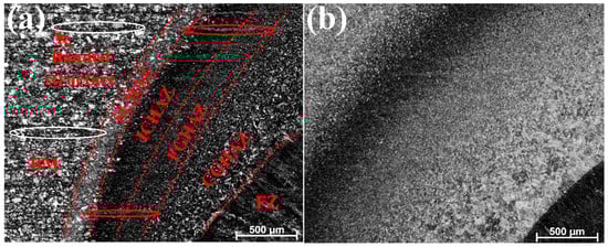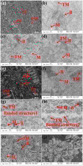 As shown in Figure 4a, two types of banded structures form in the FGHAZ, ICHAZ, SCHAZ and BM of the ULCW joint. Banded structure1 was circled by red ellipse and banded structure2 was circled by white ellipse. Etching the ULCW joint with Lepera etchant revealed that M banded structures are the main banded structures formed in the CGHAZ and ICHAZ. We examine banded structure1 (Figure 5i) and banded structure2 (Figure 5j) by SEM. The SEM micrographs revealed that banded structure1 is a mixed structure composed mainly of M, TM, and B, and banded structure2 consists of TM. Chemical inhomogeneity and hot rolling yield a banded structure in HSLA, which (owing to strain anisotropy) is detrimental to the mechanical properties of steel []. During the ULCW process, the ULCW joint is subjected to multiple rapid heating and cooling (water quenching) steps, which reduced the chemical homogeneity of the material. During the UDW process, preheating, maintaining the inter-pass temperature at 100 °C, and air cooling lead to a decrease in the cooling rate during UDW. This yield increased time for diffusion of the alloying elements thereby mitigating chemical inhomogeneity. Further, the less banded structure in the UDW joint could be due to inevitable variations of chemical inhomogeneity between different pieces of the base plate, which is a common feature of lab-made materials.
