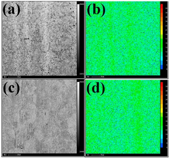 The elemental distribution of Mn in the banded structures (see Figure 6) was determined with an Electron Probe Microanalyzer (EPMA). In Figure 6b or Figure 6d, blue and green represent low content and medium content, respectively, while yellow and red correspond to high content. Mn is inhomogeneously distributed in both banded structures. As Figure 6b shows, Mn-segregated bands parallel to the rolling direction occur in the FGHAZ and ICHAZ of the ULCW joint. The Mn-poor bands (level value: 5–12; unit: X-ray counts) and Mn-rich bands (level value: 12–21) are composed of B and M, respectively. The Mn-poor bands (level value: 5–12) are mainly composed of TM, and Mn-rich bands (level value: 12–21) within the SCHAZ of the joint are mainly composed of B (Figure 6d). The occurrence of banded structures is attributed to the inhomogeneous distribution of Mn in welded joints.
