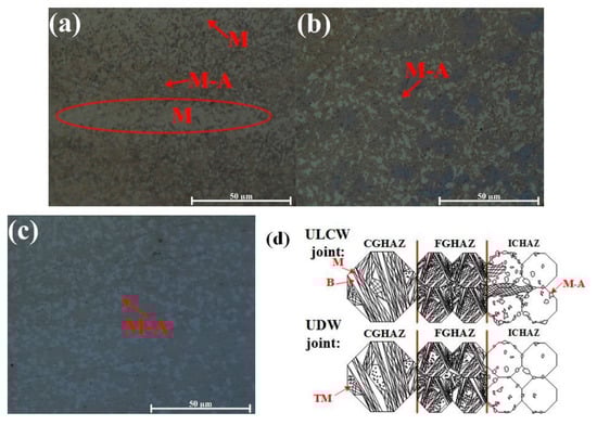 The distribution and fraction of martensite–austenite islands (M–A) within ICHAZ (see Figure 7a–c) is revealed through etching with Lepera etchant. The distribution of M and M-A components within the HAZ of the ULCW joint and the UDW joint are schematically illustrated in Figure 7d. Compared with the UDW joint, the CGHAZ of the ULCW joint has less TMs and Bs, but more Ms, owing to water quenching. Different trends are observed for the FGHAZ of the ULCW joint. Compared with that occurring in the ICHAZ of the UDW joint, (i) more M-banded structures form in the starting region of the ICHAZ of the ULCW joint, and (ii) the formation of M-A components is more likely along grain boundaries within the ICHAZ of the ULCW joint. These components also form along the grain boundaries at another edge of the ICHAZ of the ULCW joint. In contrast, a uniform distribution of M-A components is formed at the starting region of the ICHAZ of the UDW joint. The amount of M-A components decreases with increasing distance to the FGHAZ within both joints. These components are almost absent from another edge of the ICHAZ of the UDW joint.
