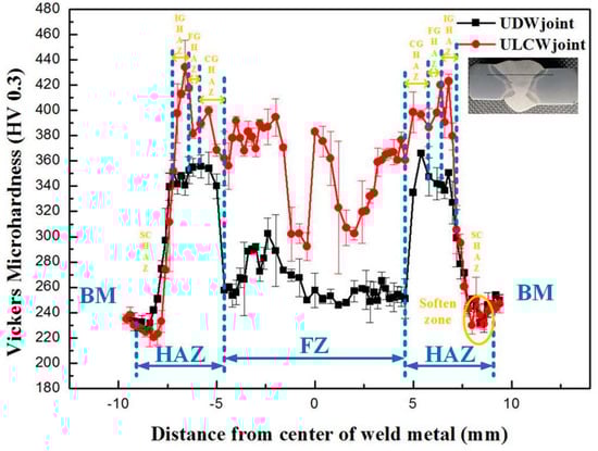 The FZ, HAZ, and BM of both types of joints can be written in descending order of the average micro-hardness values, as follows: HAZ > FZ >BM. Furthermore, the micro-hardness values of the HAZ and FZ of the ULCW joint are higher than those of the HAZ and FZ of the UDW joint. The peak micro-hardness of the HAZ of the (i) ULCW joint occurs in the ICHAZ (peak value: ~430 HV0.3) and (ii) UDW joint occurs in the CGHAZ (peak value: ~360 HV0.3). In addition, the soft HAZ of the ULCW specimen is wider than the softened zone of the UDW specimen (~1.5 mm vs. ~1 mm).