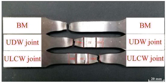 The tensile strength of the UDW specimen is higher than the strengths of the ULCW joint. The UDW and ULCW specimens all failed in the soft HAZ. The wide softened zone (with relatively low micro-hardness) results in the low tensile strength of the ULCW specimen. The YS and UTS of the ULCW specimen are 109 MPa lower and 77 MPa lower, respectively, than those of the UDW joint.